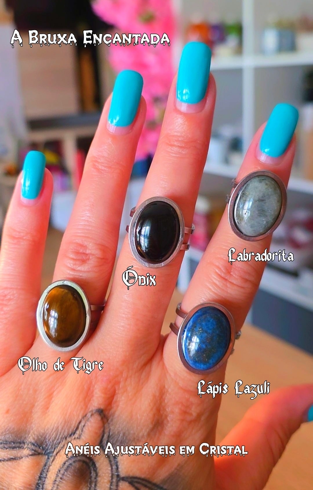 Mão com anéis ajustáveis com pedras Ônix, Olho de Tigre, Labradorita e Lápis Lazuli