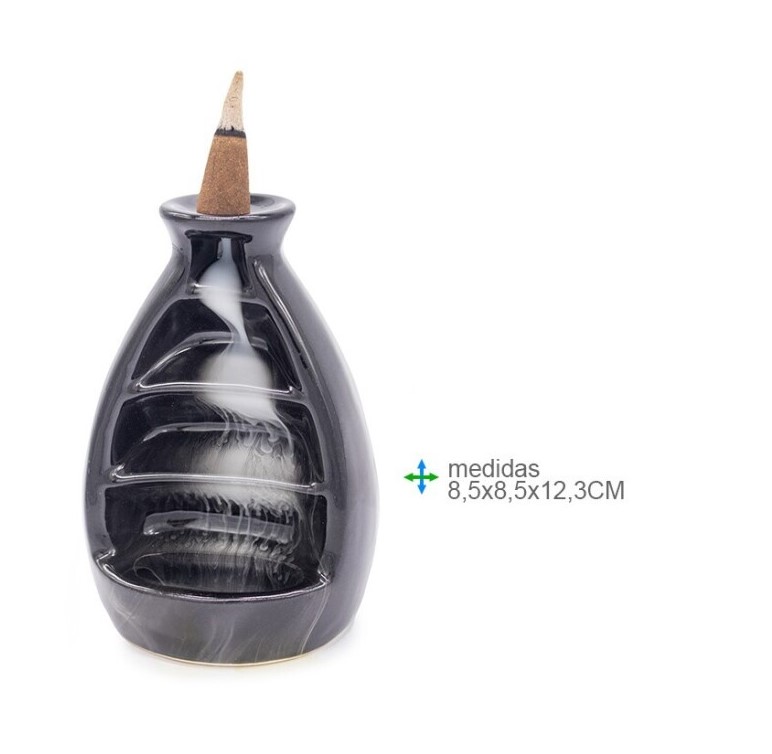 Incensário cerâmico preto com fumaça a descer em cascata