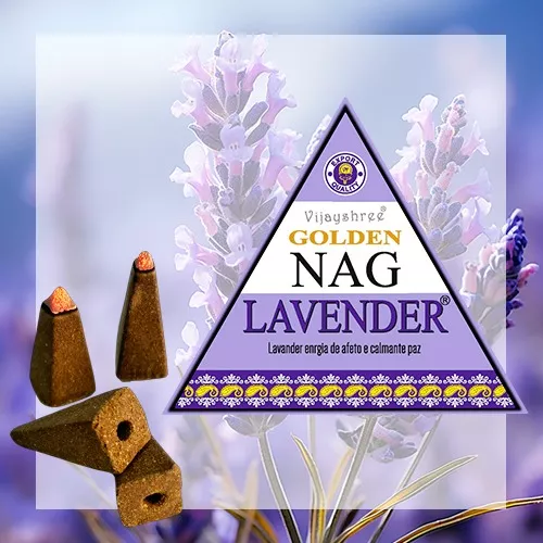 Incenso em cones com embalagem triangular lilás e branco com texto Golden Nag Lavender.