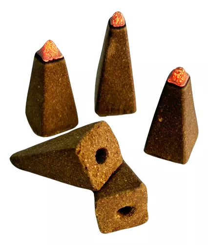 Cones de incenso castanhos com pontas vermelhas sobre fundo branco