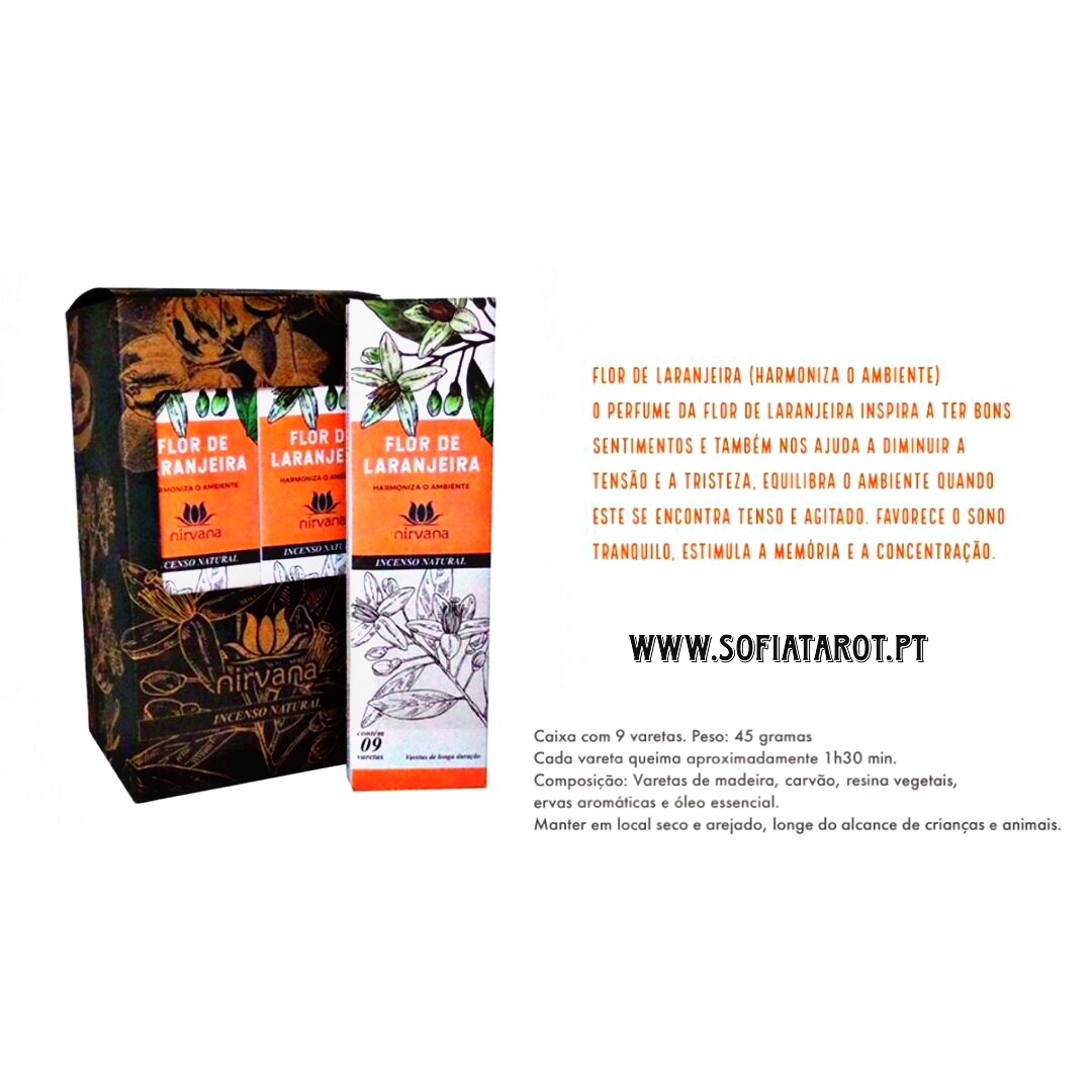 Caixa de varetas aromáticas Flor de Laranjeira Nirvana com texto descritivo e site.