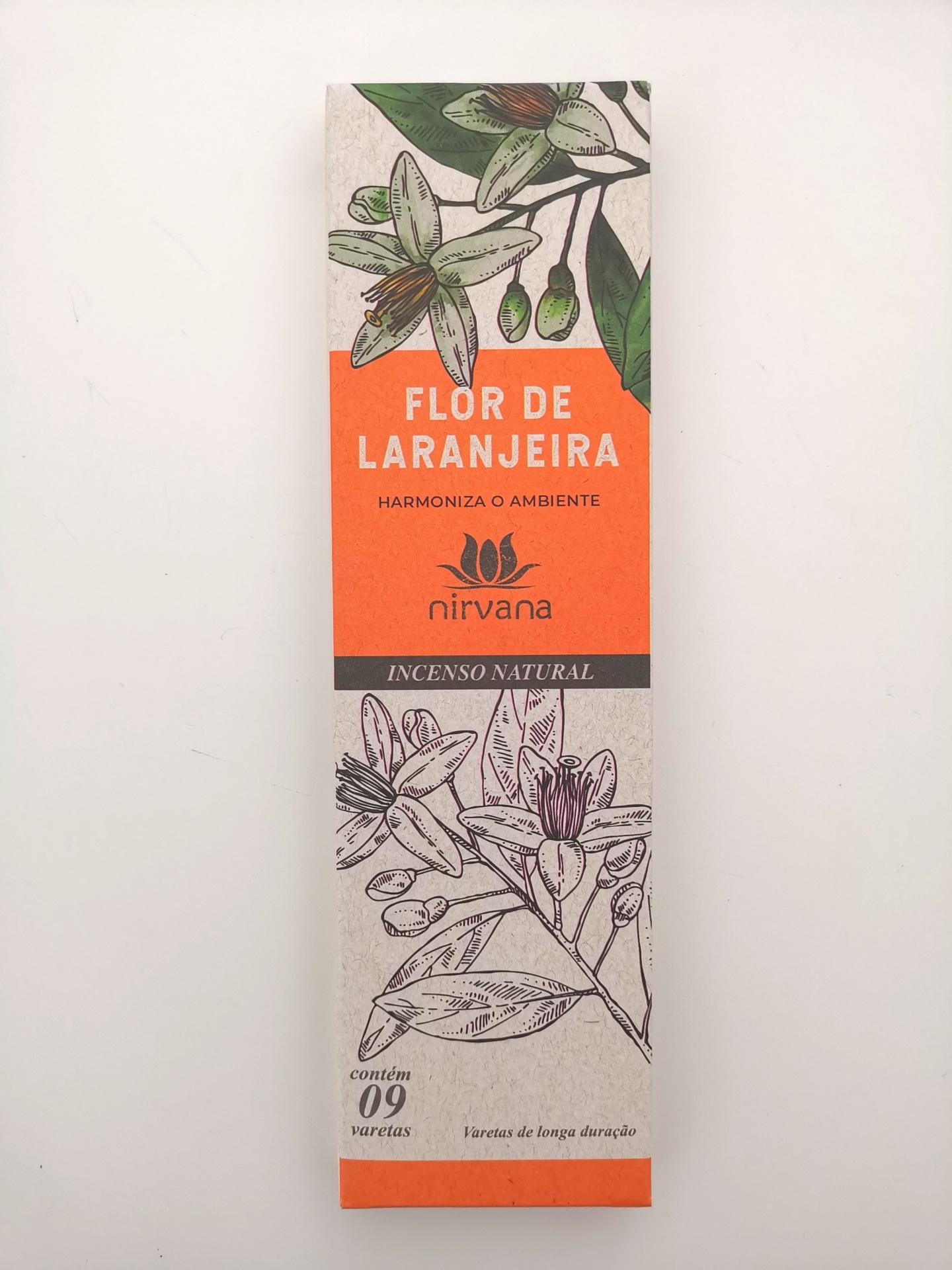 Embalagem de incenso natural Flor de Laranjeira com design floral laranja e verde