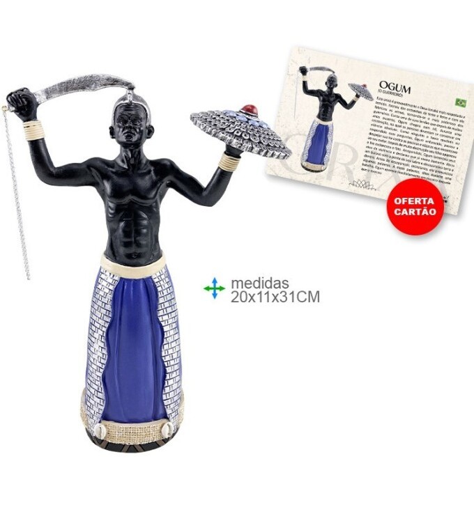 Estátua de Ogum em resina a preto e azul com espada e escudo