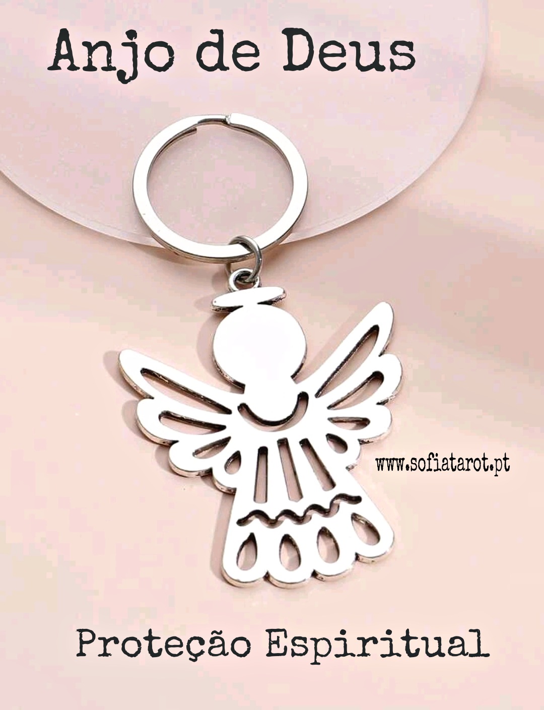 Chaveiro em forma de anjo prateado com texto Anjo de Deus, Proteção Espiritual