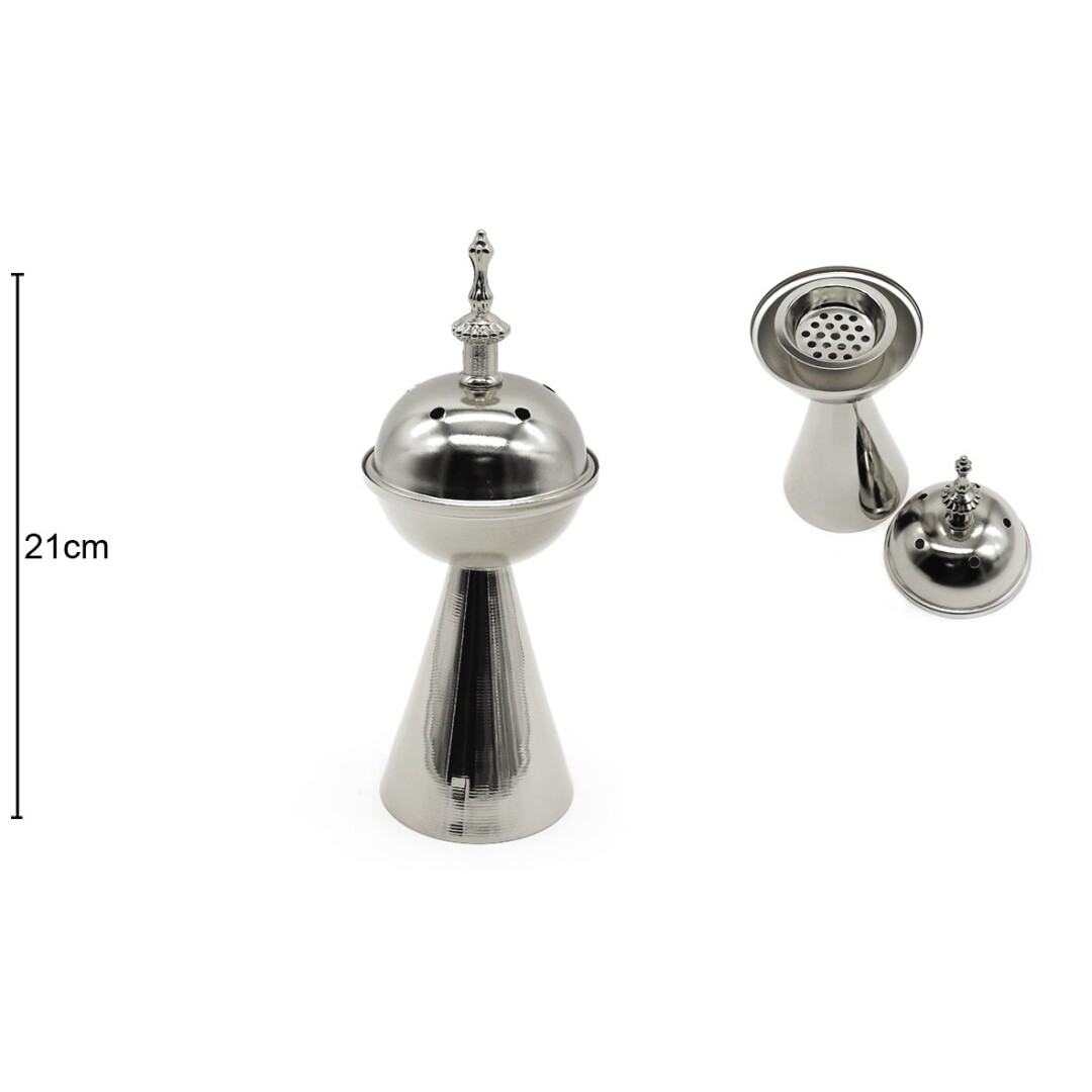 Incensário de metal prateado com tampa decorativa e base cónica de 21 cm