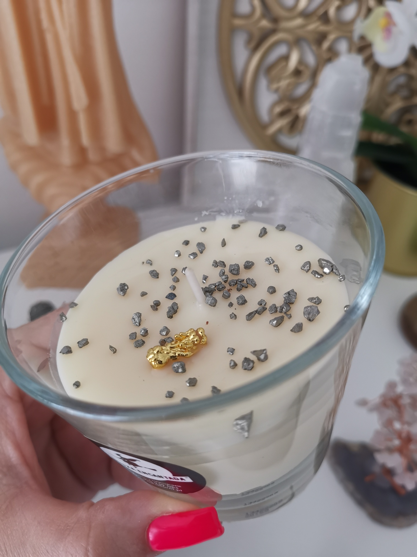Vela que trabalha a energia da Prosperidade, de uma forma contínua ; preprada com PIRITE e com o amuleto SAPO KAERU e/ou DRAGÃO PIXIU, para fortalecer a energia trabalhada. Totalmente elaborada por mim, mediante a minha energia e as minhad fórmulas específicas.