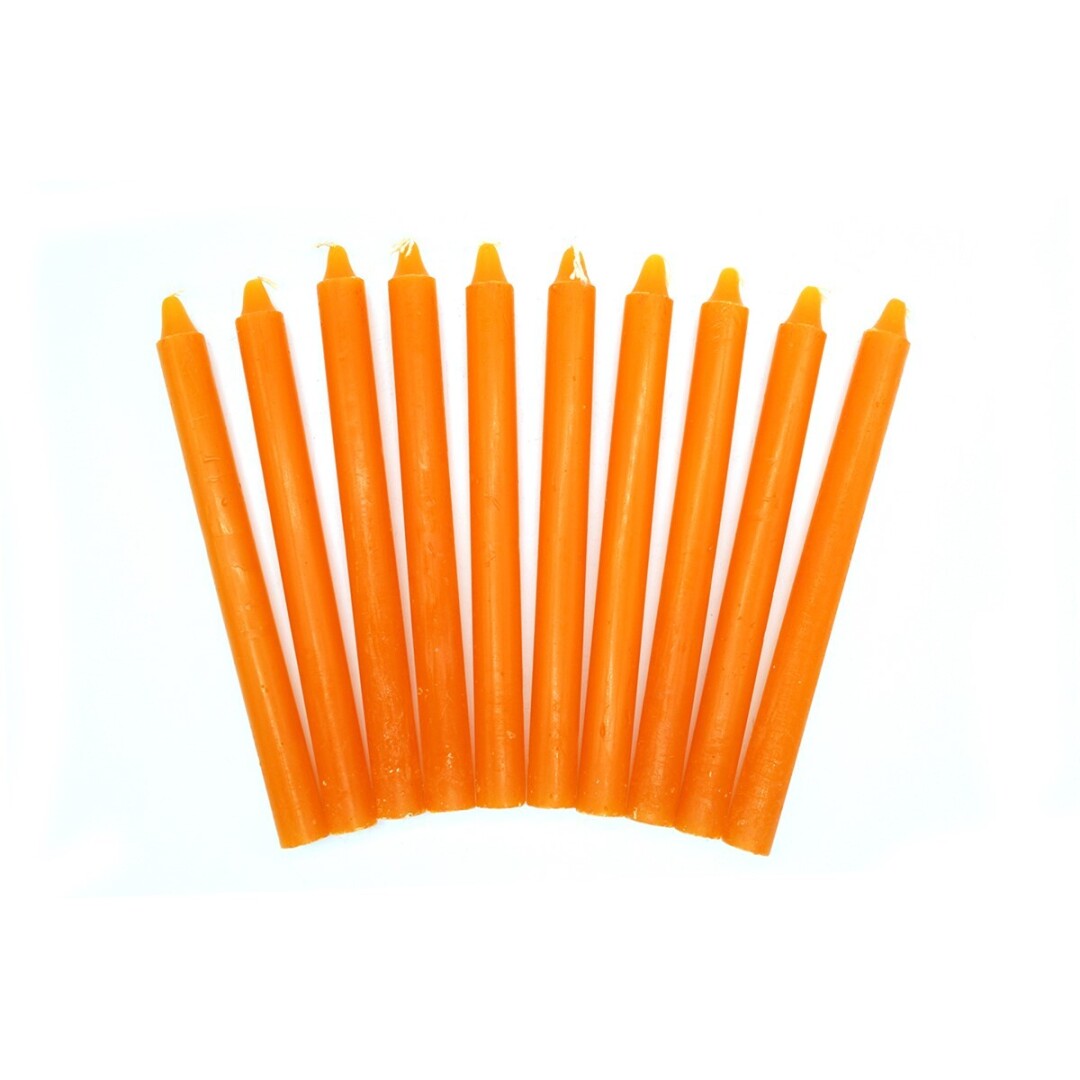 Dez velas finas laranja em leque sobre fundo branco